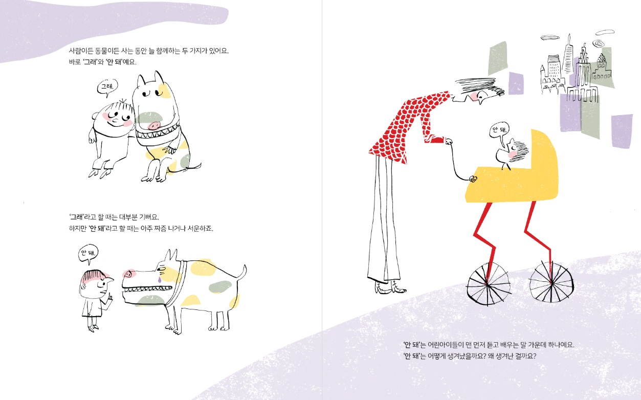 이 책은 바로 ‘안 돼’라는 말에 대한 책이에요. ‘안 돼’라는 말에 대해 이런저런 것들을 생각할 수 있게 해 주죠.